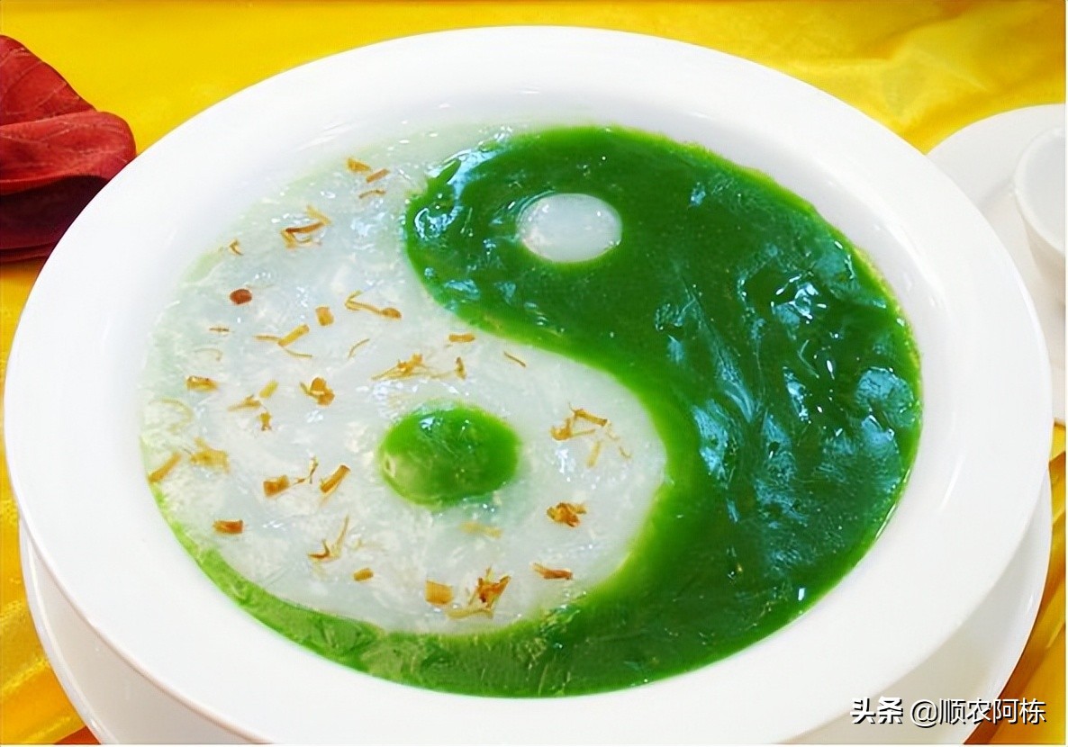 护国菜,是把番薯叶做成羹的潮州名菜,选用白梗的番薯茎尖,去除茎外纤维,焯水,冷却,用力拧干水分。剔去肥膘的猪皮铺在砧板上,防止番薯叶带上砧板味,剁碎的番薯叶泥注入龙骨老鸡熬成的高汤,调味,勾芡,潮州有句食谚“做戏神仙老虎鬼,做桌靠粉水。”勾芡是潮州菜烹饪的一项拿手绝活,为的是汤菜融合,滑润柔嫩,还有一道点睛的工序,是做护国菜最大的挑战,番薯叶泥汇入蟹肉,蛋白,只此一勺,要在菜羹上画出太极的图案,需要多年的练习,手起勺落,一气呵成。
