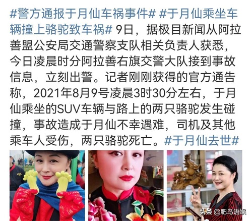 原来,在凌晨3点半的时候,谢大脚乘坐的车辆撞到了两只骆驼,造成谢大脚不幸遇难,而两只骆驼也当场死去。这就难免让瓜友想起香妃娘娘刘丹,刘丹跟于月仙是同学,连离开的方式都是如出一辙,那么这样的惨剧是否能避免呢?