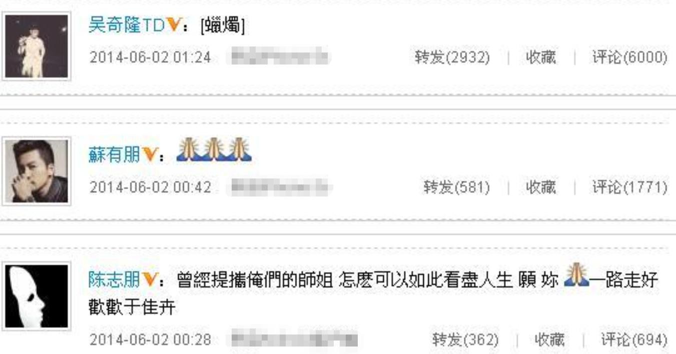于佳卉生前人缘极好,去世后无数人在微博上为她悼念,其中名气最盛、博得热度最高的,是昔日小虎队的成员陈志朋、苏有朋和吴奇隆三人。