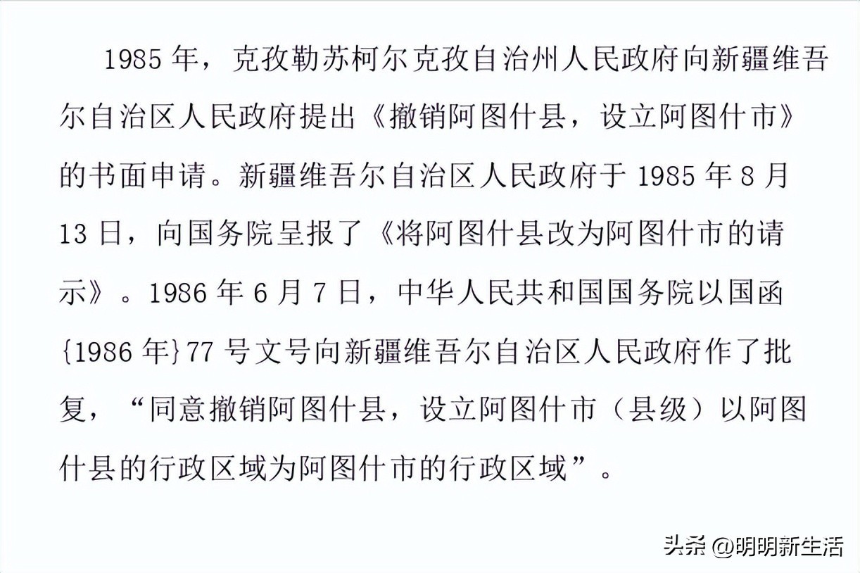 1985年,阿图什县人民政府向克孜勒苏柯尔克孜自治州人民政府提出设立阿图什市的建议。建议书提到:克孜勒苏柯尔克孜自治州首府在阿图什县。1985年,阿图什县全县人口达14万,其中常驻阿图什镇的非农业人口已达4万,城镇有机械加工、农机修造、建筑建材、食品加工、皮毛加工等中小企业47个。文化教育事业有很大发展,城镇建设也有了相当规模。城镇个体商业十分活跃,工贸市场(被誉为香港巴扎),成为南疆地区较大的批发市场,城镇的供水供电系统完善,具备了设市的条件。