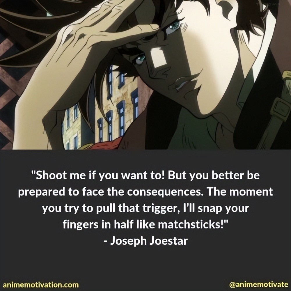 “想打我就打! 但你最好准备好面对后果。 你一想扣动扳机,我就把你的手指像火柴棍一样折成两半!” ——约瑟夫·乔斯达