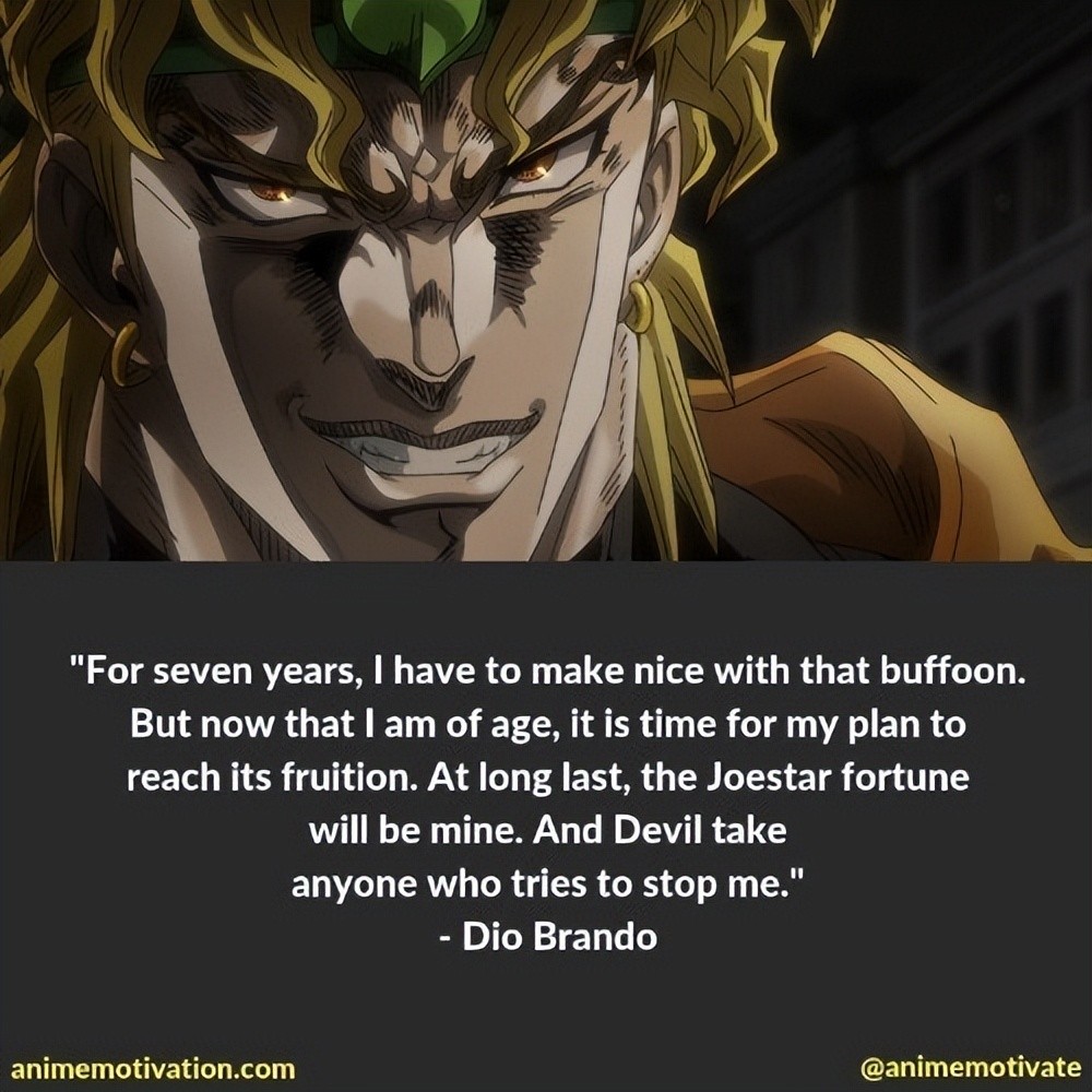 “七年来,我必须和那个丑角和好。 但是现在我已经成年了,是时候实现我的计划了。 乔斯达的财富终于要属于我了。 魔鬼会抓住任何试图阻止我的人。” – 迪奥