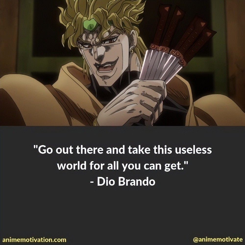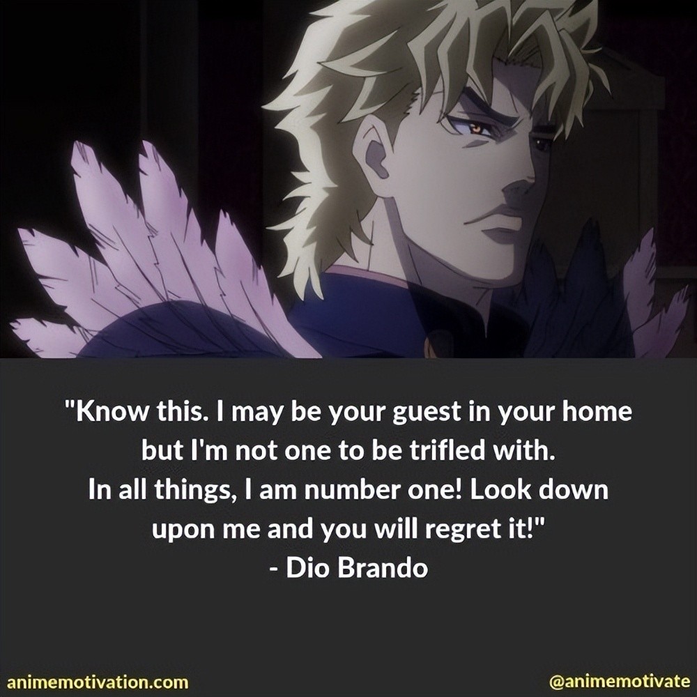 “我鄙视所有杂种。 他们吓不倒我,我只是受不了他们对不值得的人阿谀奉承。 所以让你那只肮脏的杂种狗离我远点,乔斯达!” – 迪奥