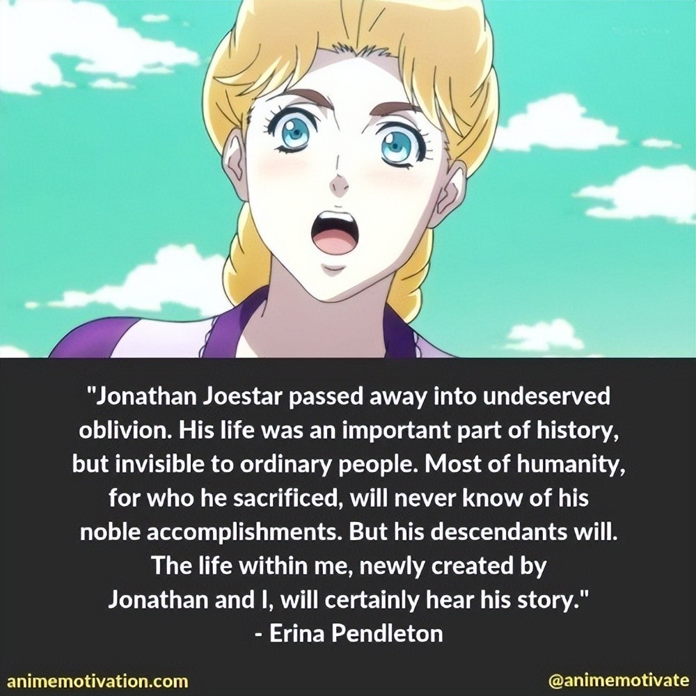 “乔纳森·乔斯达在不当的遗忘中去世了。 他的一生是历史的重要组成部分,但普通人是看不到的。 大多数人,他为谁而牺牲,永远不会知道他的崇高成就。 但他的后代会。 我和乔纳森新创造的我内心的生命,一定会听到他的故事。” – 埃里娜彭德尔顿