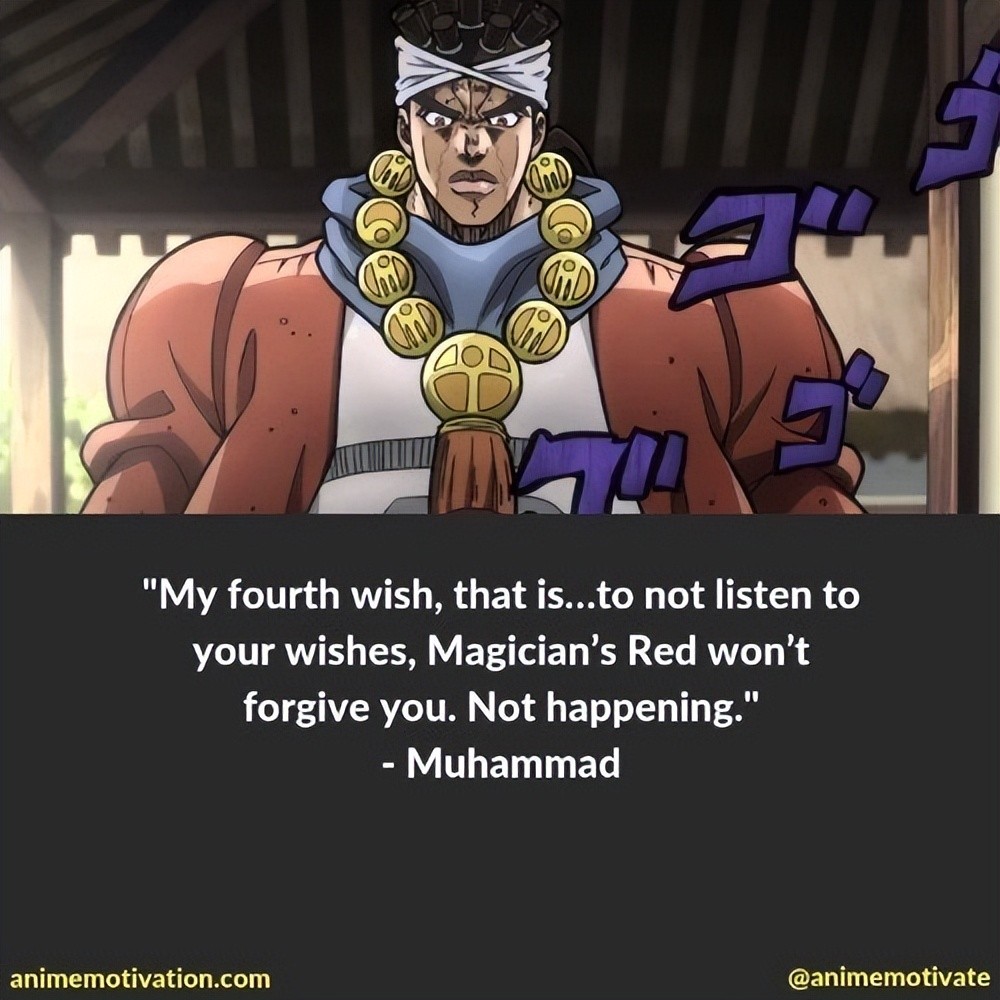 “不可能的? 在这段旅程中,我们做了很多不可能的事情。 我厌倦了听到事情是不可能的或无用的。 这些话对我们来说毫无意义。” ——九条承太郎