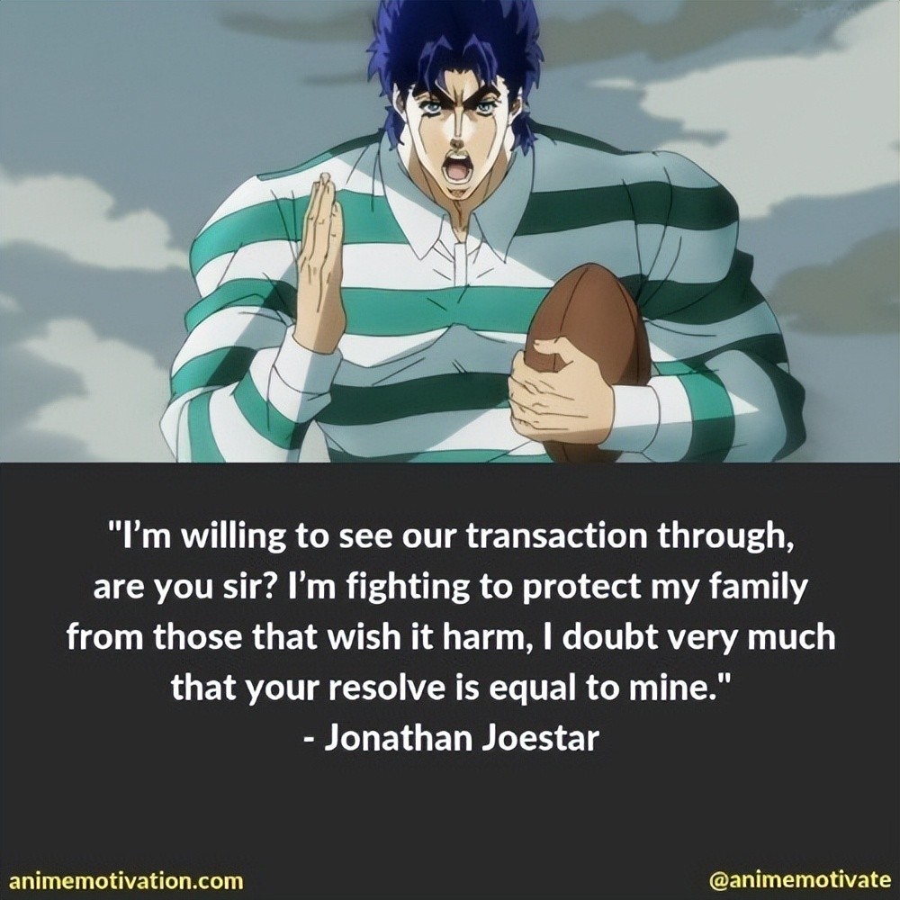 “我愿意完成我们的交易,是吗,先生? 我正在努力保护我的家人免受那些希望它伤害的人的伤害,我非常怀疑你的决心是否与我的一样。” – 乔纳森·乔斯达