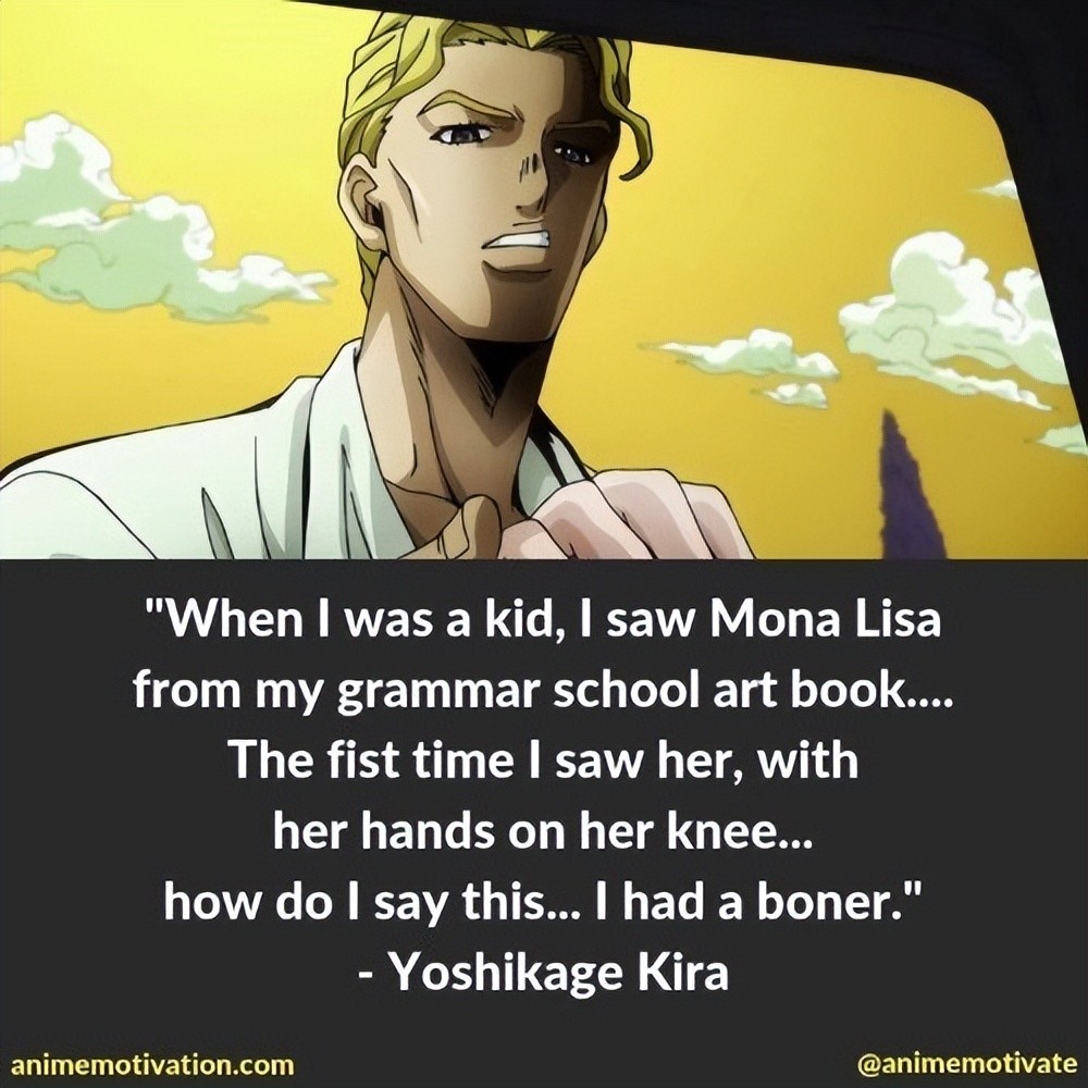 “当我还是个孩子的时候,我在文法学校的艺术课本上看到了蒙娜丽莎……我第一次看到她,她的手放在膝盖上……怎么说呢……我傻了。” – 吉良吉影