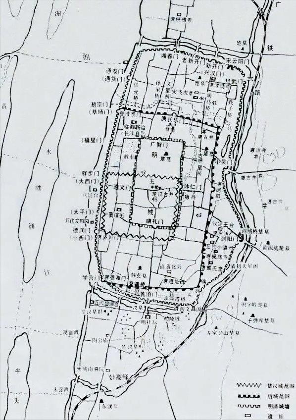 就长沙古城的范围来看,唐宋时,西濒湘江的长沙城已南扩至南门口,北至湘春门,东至浏阳门(浏城桥)。明代长沙已成为人口密集、工商业繁荣的商埠。砖土建筑的城墙,改筑石基。大致宽五里,长十里。到了清初,长沙城墙增厚加高,多次整修。