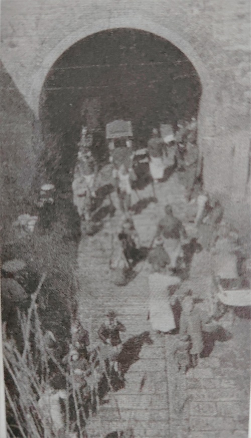 从湘春门这张老照片看,拱形的门洞直通城内,照片里有很多头戴斗笠穿短褂短裤的人,有的推着土车,有的独自行走。