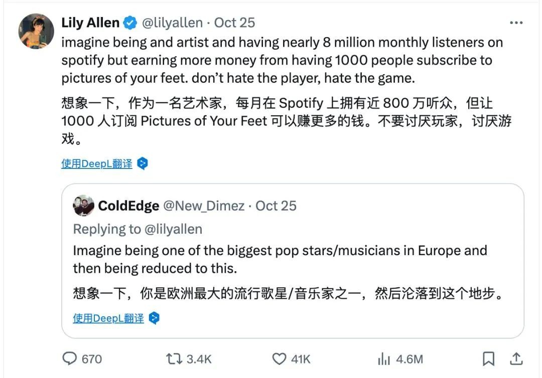 Lily Allen,英国流行歌手,在Spotify上拥有将近800万的月听众,而她在Onlyfans是一个“脚部内容”创作者,大约有1000人订阅了她的内容。而令人难以置信的是,这1000人的订阅比800万的听众带给她的收入更高。