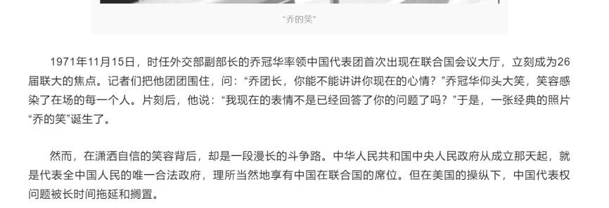 1971年11月15日,中国代表团在乔冠华的带领下首次出现在联合国会议大厅时,立即成为那一届联大的焦点,那张仰头大笑的照片也感染了每一个人。