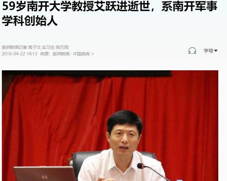 参考资料:澎湃新闻:《59岁南开大学教授艾跃进教授逝世,系南开军事学科创始人》发布时间:2016.4.22