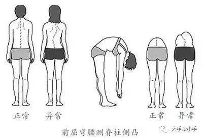 其实,大家只要记住我简单一句话——可以定期帮孩子检查一下,孩子身体保持直立前屈,你从后方向前,观察孩子的胸廓,以及两侧肌肉的对称程度。