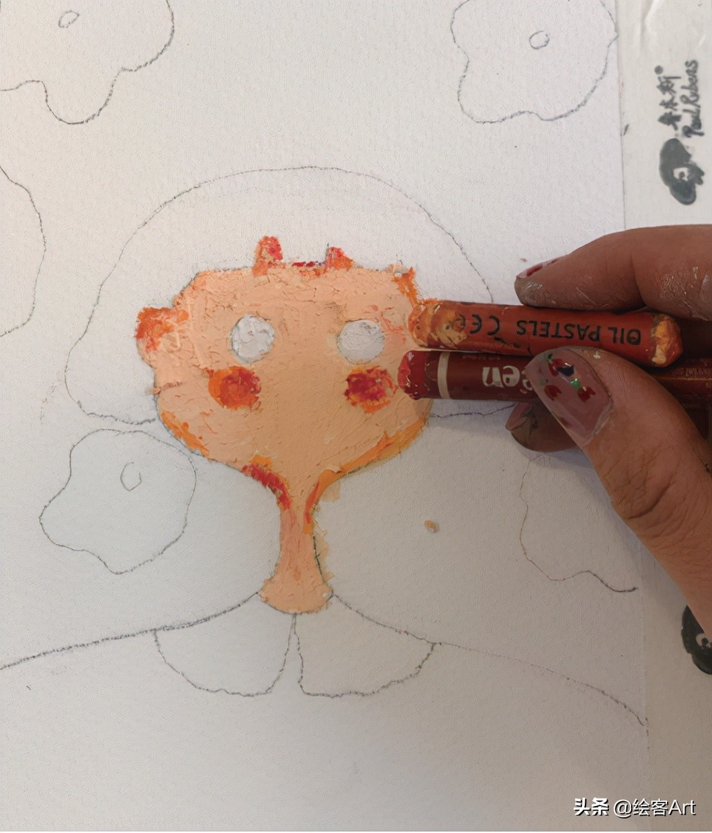 03.用嫩肤色平涂脸、耳朵和脖颈的部分,边缘部分需要用油画棒的侧面上色。