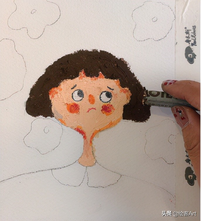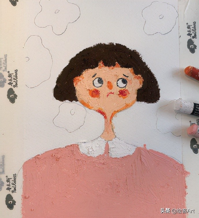 04.脸颊的腮红和头发的暗部用红色和橙色迷你油画棒交替上色, 呈现出脸部的立体感。