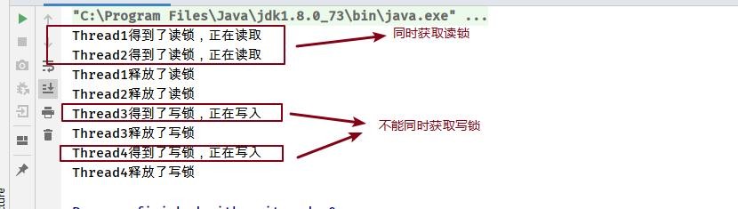 public class ReadWriteTest { private static ReentrantReadWriteLock reentrantReadWriteLock = new ReentrantReadWriteLock(); private static ReentrantReadWriteLock.ReadLock readLock = reentrantReadWriteLock.readLock(); private static ReentrantReadWriteLock.WriteLock writeLock = reentrantReadWriteLock.writeLock(); private static void read() { readLock.lock(); try { System.out.println(Thread.currentThread().getName() + "得到了读锁,正在读取"); Thread.sleep(1000); } catch (InterruptedException e) { e.printStackTrace(); } finally { System.out.println(Thread.currentThread().getName() + "释放了读锁"); readLock.unlock(); } } private static void write() { writeLock.lock(); try { System.out.println(Thread.currentThread().getName() + "得到了写锁,正在写入"); Thread.sleep(1000); } catch (InterruptedException e) { e.printStackTrace(); } finally { System.out.println(Thread.currentThread().getName() + "释放了写锁"); writeLock.unlock(); } } public static void main(String[] args) { new Thread(() -> read(), "Thread1").start(); new Thread(() -> read(), "Thread2").start(); new Thread(() -> write(), "Thread3").start(); new Thread(() -> write(), "Thread4").start(); } }