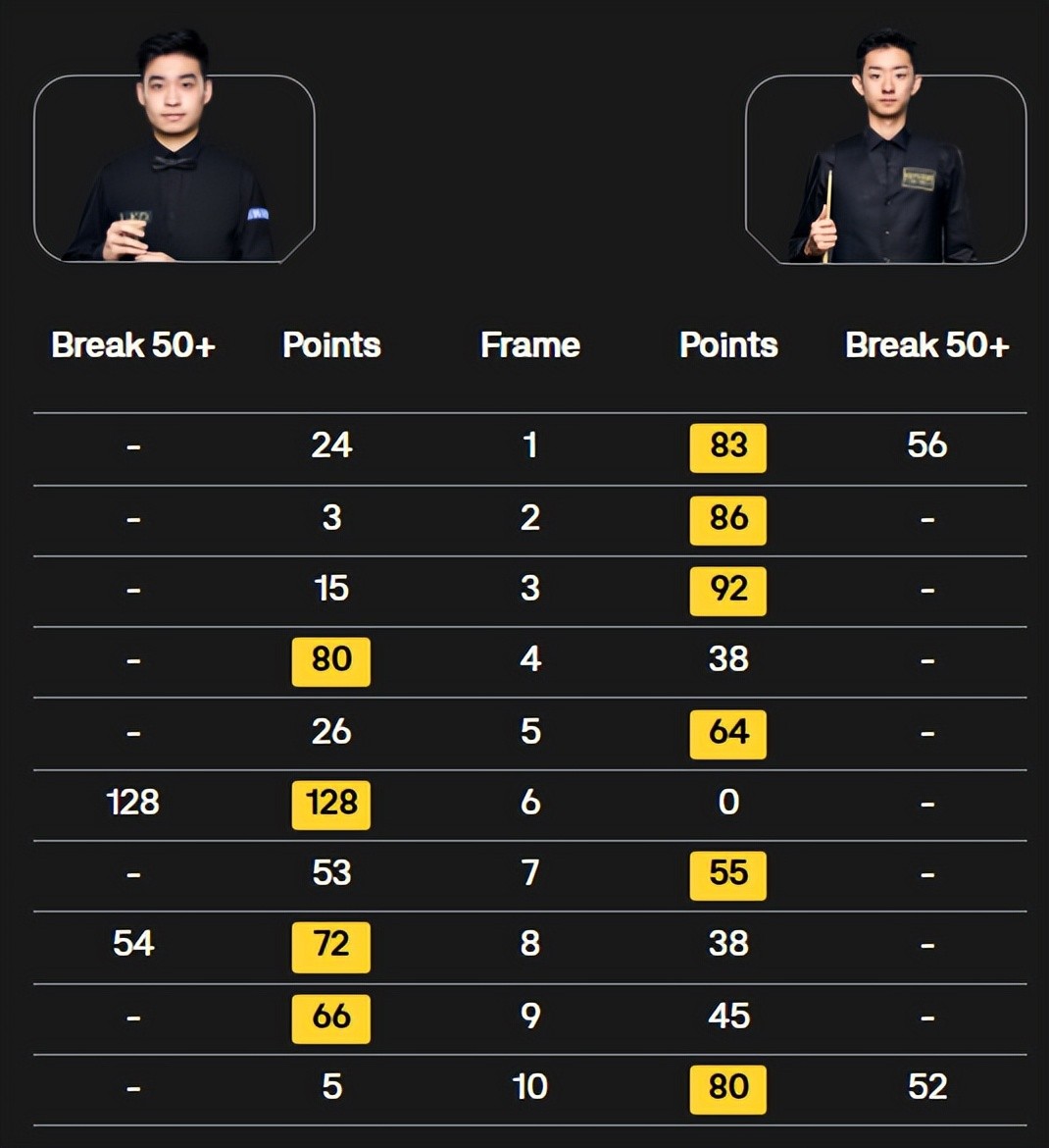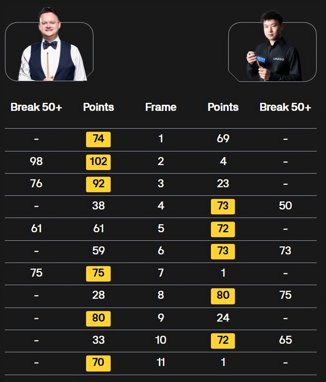 综上不难看出,丁俊晖和吴宜泽两名球员晋级16强,斯佳辉、肖国栋、赵心童止步于正赛首轮,遗憾出局。而在已经结束的3个比赛日,其余场次正赛首轮结果为: