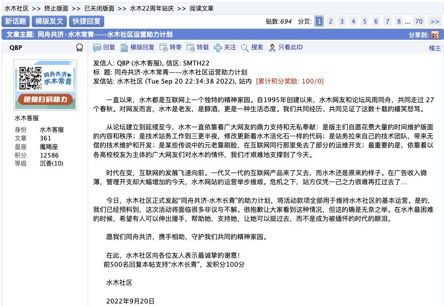 9月20日晚间,水木社区站方发布公告称,在广告收入微薄,管理开支却大幅增加,“水木网站的运营举步维艰”。当天,水木社区正式发起“同舟共济·水木长青”的助力计划,将活动款项全部用于维持水木社区的基本运营。