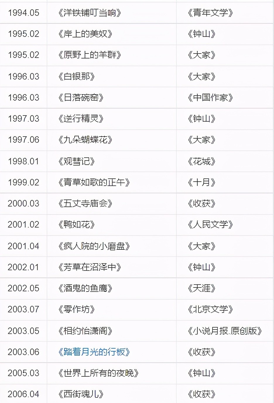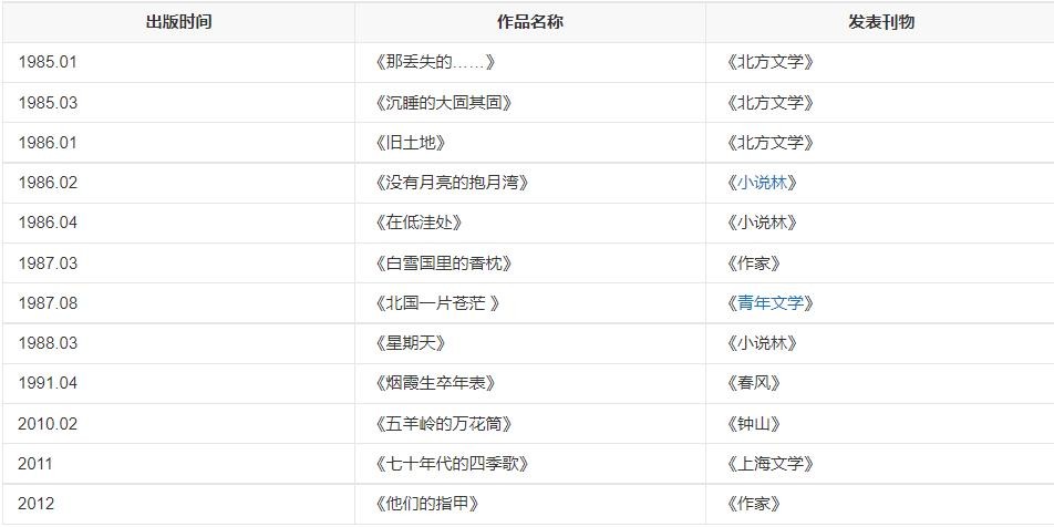 1994年,在《收获》杂志上发表了小说《向着白夜旅行》。