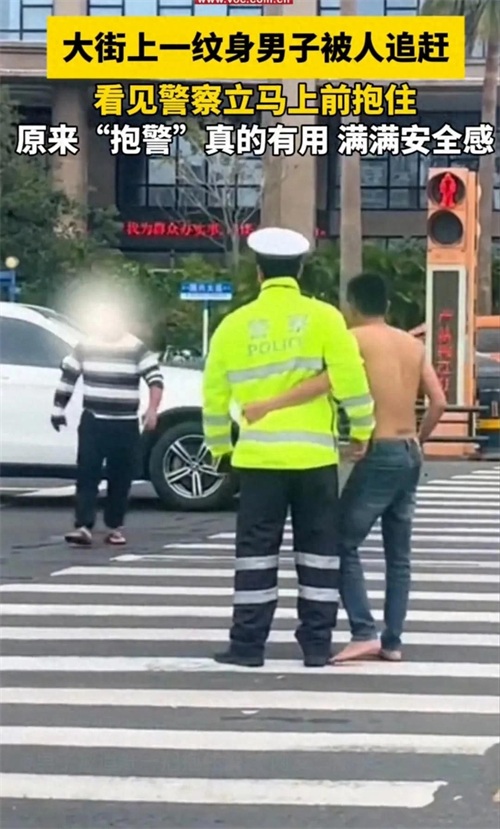男子被追赶,看到警察猛然抱住,追赶者悻悻离去。