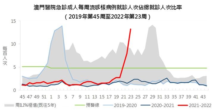 根据医院流感样疾病监测资料显示,澳门流感样病例就诊人次由5月初开始上升,尤以成人病例明显。其中第23周成人急诊因流感样病例就诊人次占总就诊人次的比例,为每百人次有13.2人次,较前一周7.9人次及前四周2.7人次分别上升66.3%和384.4%,较去年同期的1.9人次上升近586.9%;而儿科急诊的比例为每百人次有42.1人次,较前一周32.0人次及前四周21.7人次分别上升31.3%和93.4%,较去年同期的18.6人次上升近126.3%。