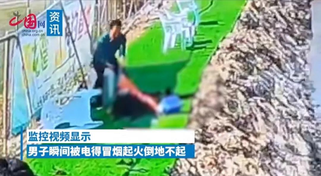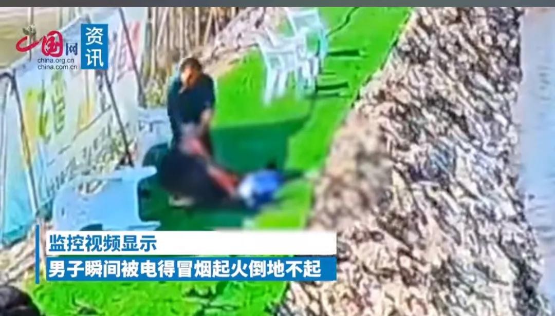 1月3日,上海一处钓鱼场突发事故,一男子在钓鱼时不慎触碰高压线,瞬间冒烟起火倒地不起。