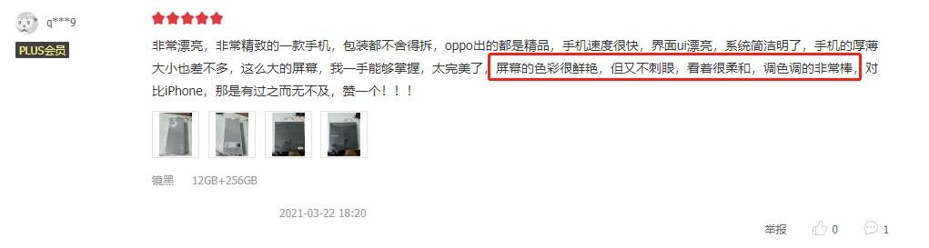 LTPO技术、O-Sync超频响应、全链路10bit,对于这些技术上的提升,用户在拿到真机之后感知也非常明显。在某电商平台的评价中,不少真实用户都对OPPO Find X3 Pro的屏幕给了一个较高的评价。像是屏幕清楚、色彩艳丽、看着舒服等等,都给消费者带来了较为优秀的屏幕使用体验。