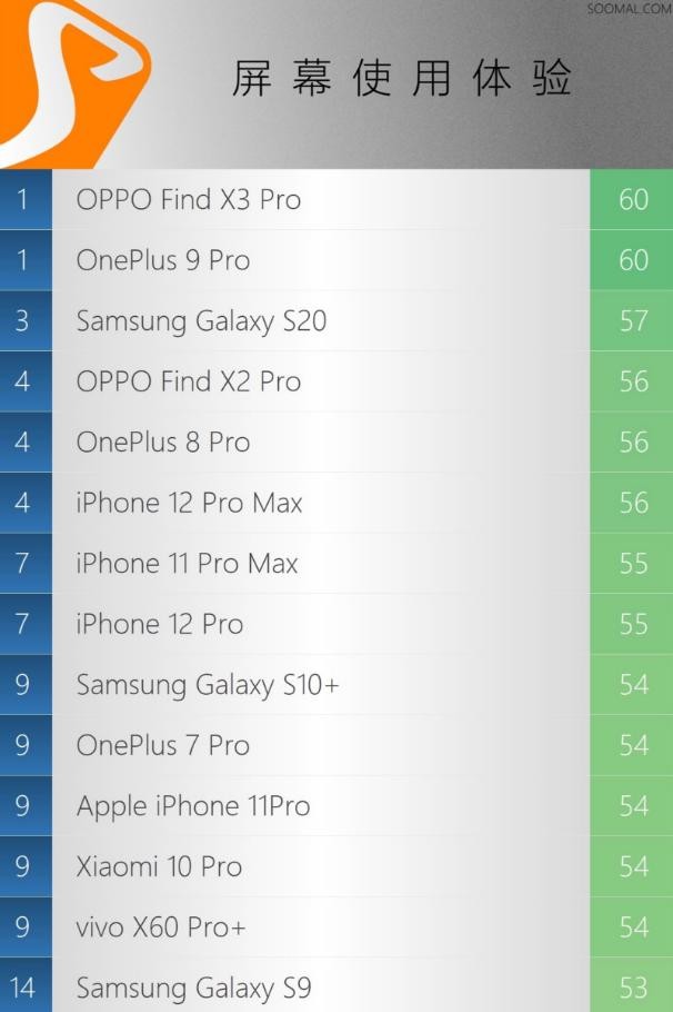 有网友在网上分享了自己看到的一份最新的手机屏幕使用体验排行榜,其结果相信会让很多人感到意外,OPPO Find X3 Pro以60分的成绩登顶第一,远超三星苹果。而三星自家的旗舰S20排名第三、苹果的iPhone12 Pro Max更是跌出前三,排到了第四名。下面我们就来分析分析OPPO Find X3 Pro的屏幕到底好在哪里。