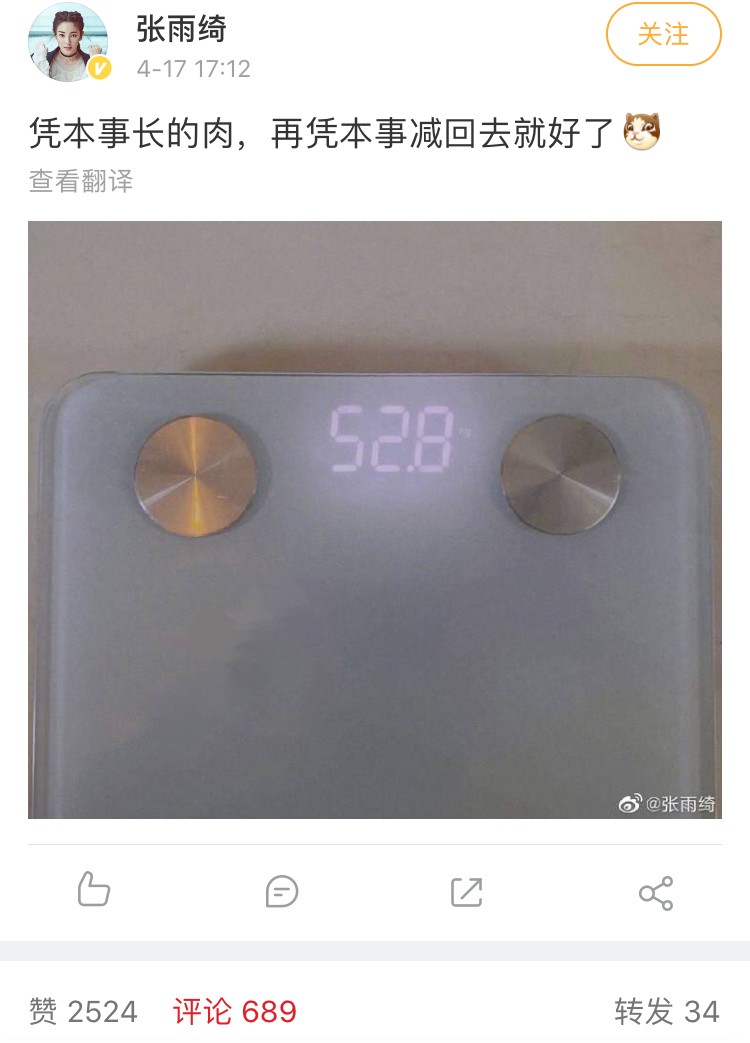 除了在微博上宣称要减肥,张雨绮还大方秀出了自己当下的体重数字:52.8公斤。