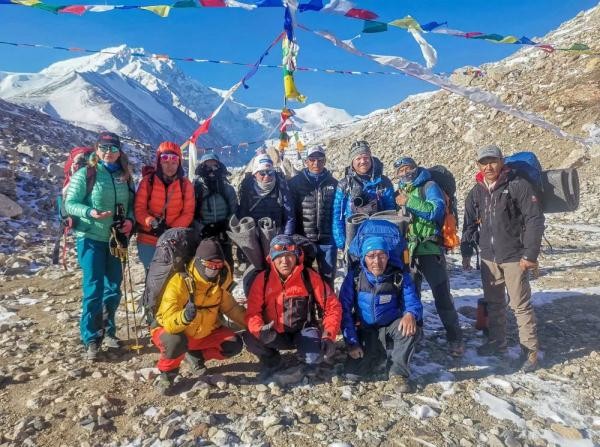 4月23日,出发攀登希夏邦马峰前,董红娟(后排左三)和队友合影留念。新华社发