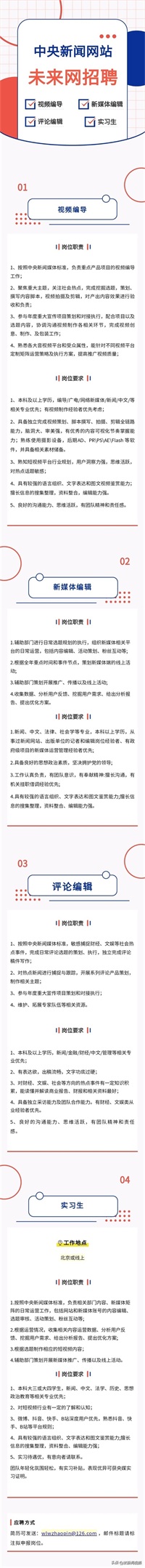 因事业发展需要,未来网依托运营主体中青未来(北京)网络科技有限公司面向社会公开招聘政治素质过硬、热爱互联网新闻事业、创新能力强、具有良好团队意识的优秀人才加入。招聘岗位见下图~