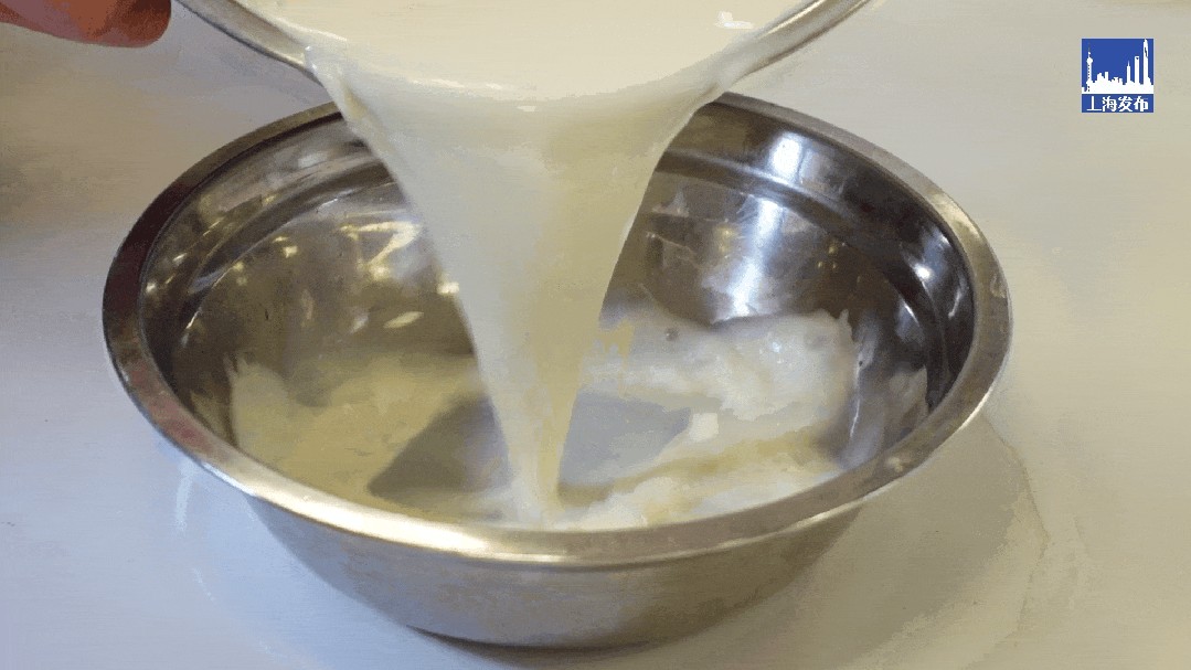3.化开的内脂粉倒入豆浆,撇去浮沫,包保鲜膜,静置15分钟。