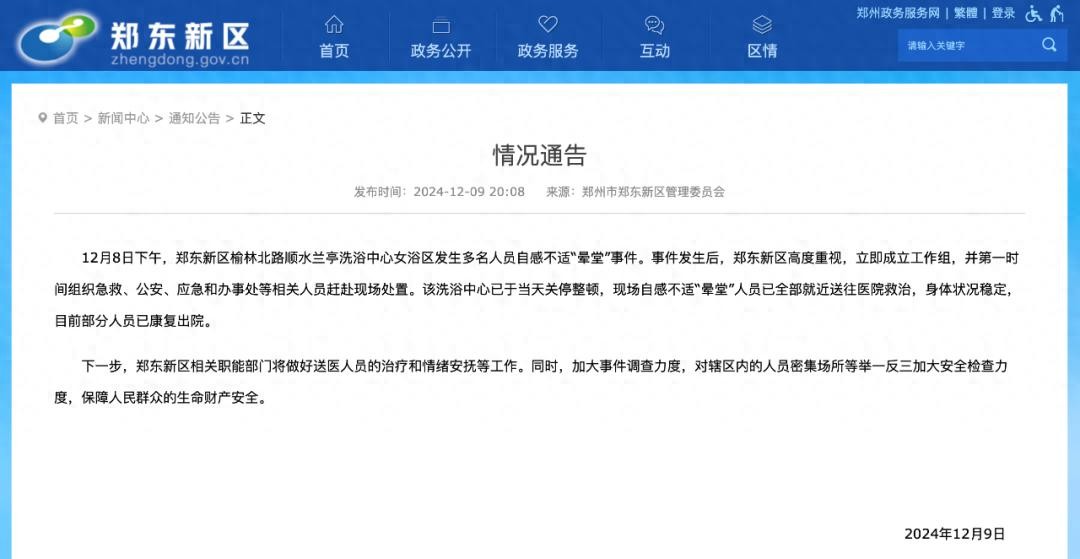 12月9日晚,针对此事,河南郑州市郑东新区管理委员会发布情况说明称,郑东新区榆林北路顺水兰亭洗浴中心已于当天关停整顿,现场自感不适“晕堂”人员已全部就近送往医院救治,身体状况稳定,目前部分人员已康复出院。