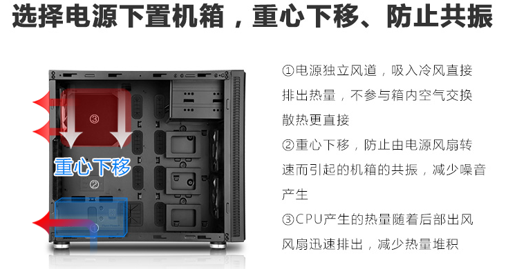 黑洞3与一代最大的不同点了,结构不同。黑洞一代采用的是ATX-II结构,也就是电源仓和硬盘仓是独立的,在机箱背部;黑洞3则采用的是ATX-III结构,又将电源仓改到了前面,便于打造垂直风道。