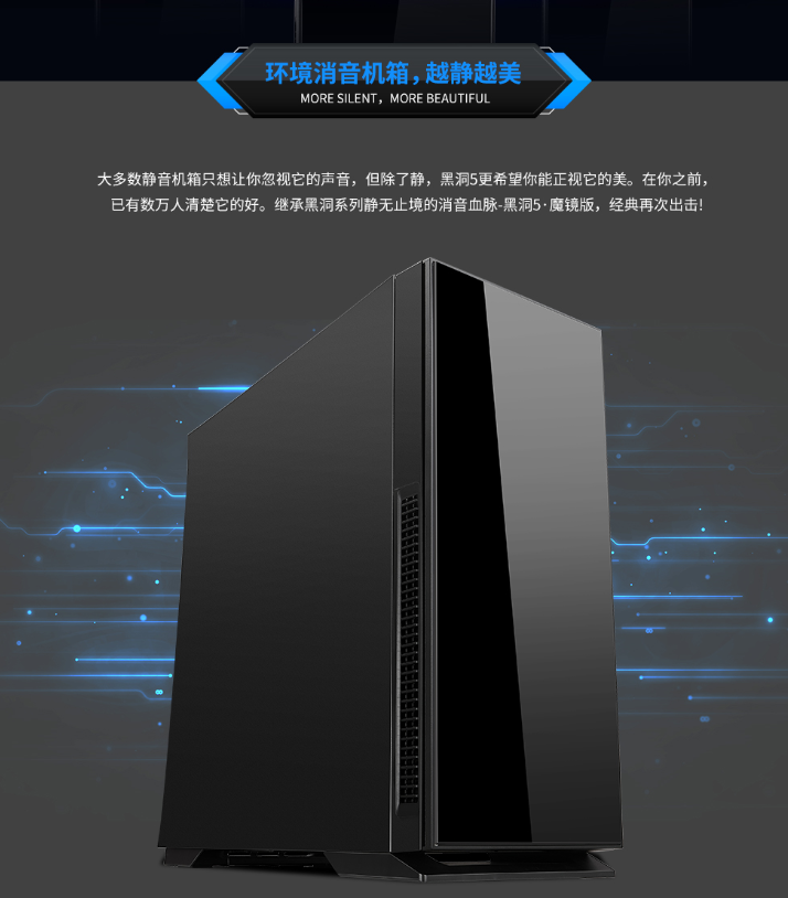 先马主打静音的机箱”先马黑洞”为玩家设计而生。黑洞静静地存在于浩瀚宇宙中,无声,却被一直探索,与先马推出静音机箱的理念如出一辙。黑洞外观大气沉稳,前面板采用了可开启设计,光驱、前置风扇位置都被隐藏在开合面板里面,这样的设计除了外观看起来更简洁以外,更多的还是为了屏蔽噪音,保证出色的静音效果。而后先马黑洞小音箱为了响应玩家的需求也诞生了,变的是体积,不变的是黑洞的本质。