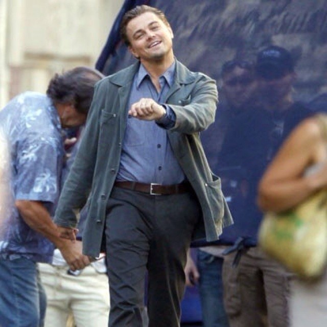 这张图出现的频率也比较高,通常搭配其他人物使用。这张图是莱昂纳多在片场休息时被人抓拍到的,那魔鬼的步伐搭配痴汉的表情让此图广为流传。