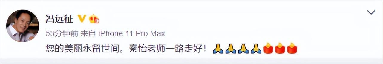 曹可凡晒出与秦怡老师的发多张合照写道:“秦怡老师!我们永远怀念您”;冯远征悲痛发文:“您的美丽永留人间。秦怡老师一路走好”;演员孙茜回忆俩人曾合作的《母仪天下》,赞秦怡老师是自己精神灯塔,永远都在。