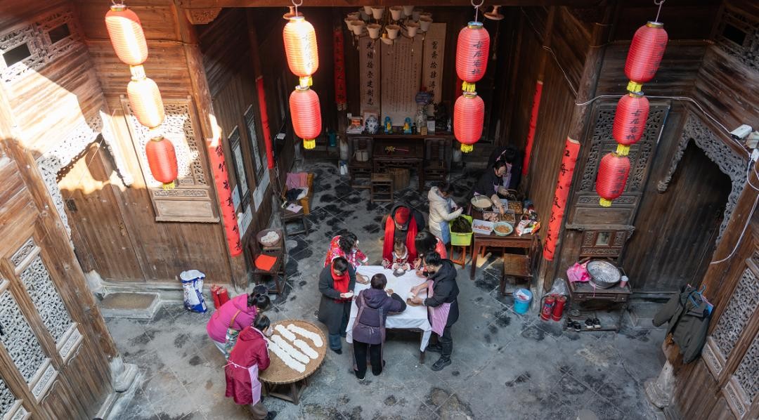 与村民游客一起,包粽子、打食桃、写春联,学习非遗手工技艺,看徽州民俗表演……
