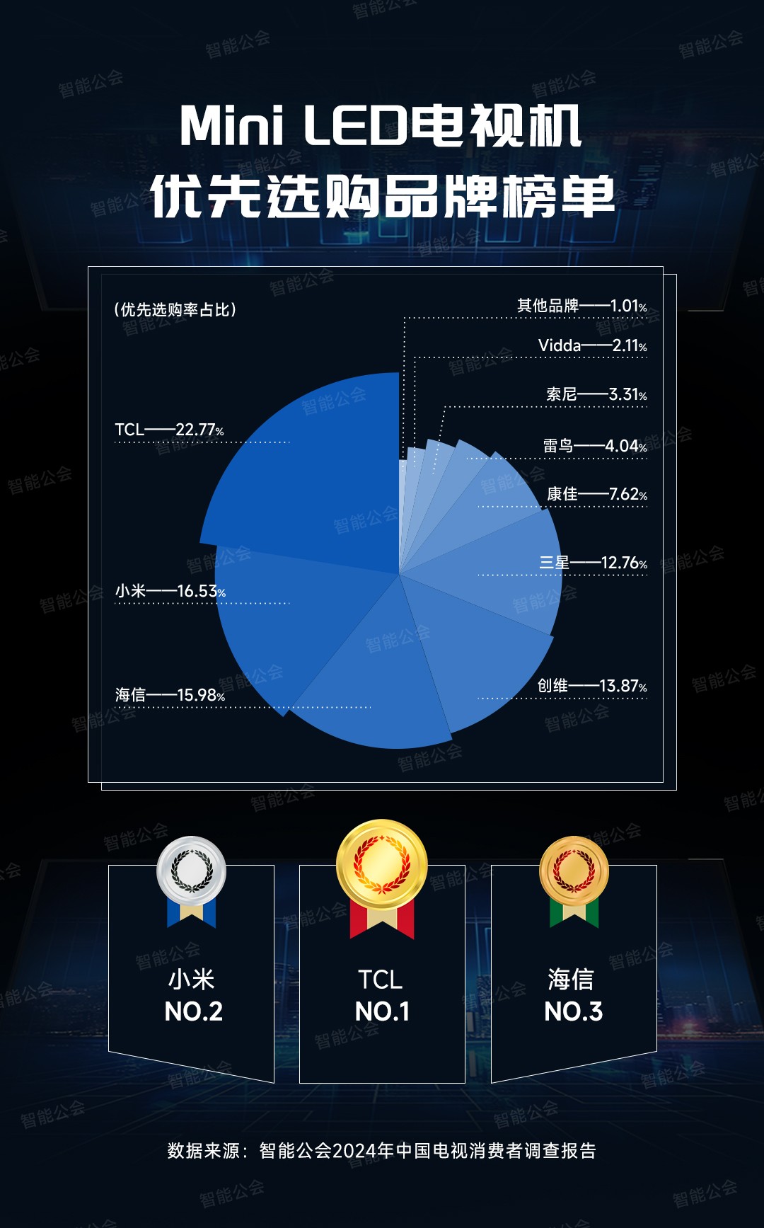 据智能公会的调查报告数据显示,2023年Mini LED电视产品top品牌表现排名和Mini LED电视机优先选购品牌榜单排名,TCL均是第一,可以说,TCL在Mini LED领域就是目前口碑最好的电视机品牌。