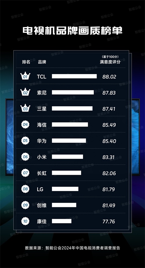 那么,哪个电视品牌最受消费者欢迎呢?近日,国内调研机构智能公会针对这一问题,做了个2024年中国电视消费者调查报告,并且针对用户满意度对2024年电视机品牌排行榜前十名进行了最新统计,其中三星电视、TCL电视、海信电视、索尼电视、小米电视、长虹电视、创维电视、LG电视、华为电视和康佳电视名列前十,是目前口碑最好的电视机品牌。