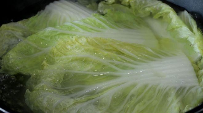 4、 锅内倒入足量的水,水开后下入白菜,煮软后捞出控水。