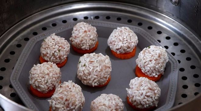 5、 把腌制好的肉泥搓成一个个肉丸,放在糯米中滚一滚,等到肉丸表面充分裹满糯米,将肉丸放在胡萝卜片上。