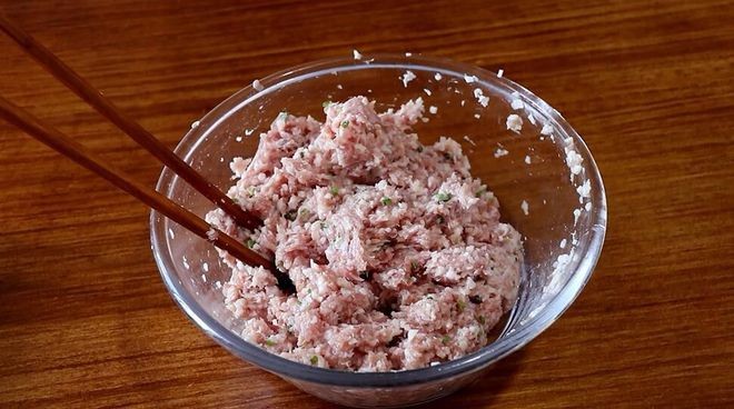 3、 剁好的肉糜放入碗中,加入切碎的藕末、葱姜末、生抽、白糖、白胡椒粉调味,用筷子顺着一个方向搅拌上劲。
