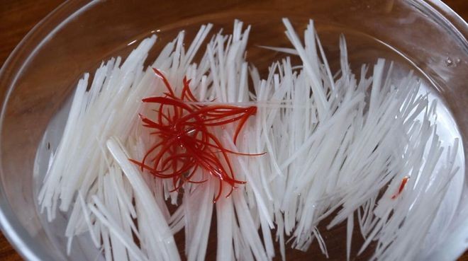 1、 把青红椒和大葱分别切成丝,准备一小碗清水,把它们放进去浸泡。