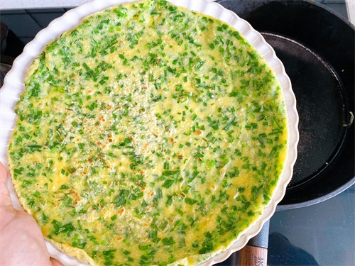 7、出锅装盘,前后只要8分钟就完成了,颜色翠绿,香味浓郁,Q弹有嚼劲的韭菜薄饼,当早餐或者是主食都是可以的,老人小孩都能吃;