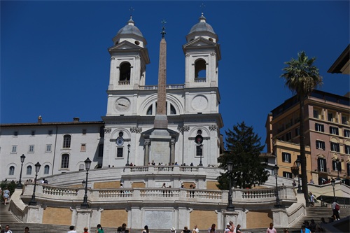 有三处跳舞场的西班牙台阶上建有古代埃及的方尖塔,方尖塔的后面是山上圣三一教堂,俯瞰整个广场。被称为“意大利人设计、法国人出资、英国人游览、如今被美国人占领”的西班牙台阶,实际上是1725年得到法国大使的援助后修建的,又因为西班牙使馆在这里,所以取名西班牙台阶。