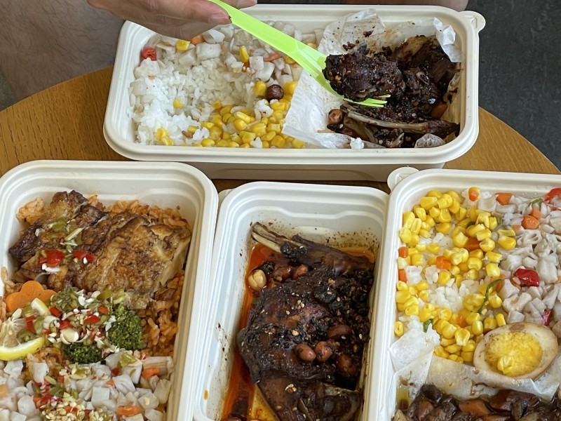 观观立马大气地点了几份明星产品:香辣鸡腿饭、卤肉饭、泰式酸辣饭还有二两一份的香辣机翼兔腿!