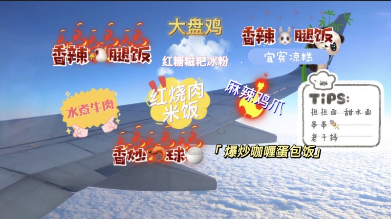 “叮咚”!尊敬的各位女士、各位先生,晚上好,欢迎您搭乘四川航空的四川观察号航班,今天我们为您准备的有香炒虾球米饭、香辣鸡腿饭、香辣兔腿饭、红烧肉米饭、还有水煮牛肉、麻辣鸡爪、宜宾凉糕、红糖糍粑冰粉、爆炒咖喱蛋包饭、大盘鸡、担担面、甜水面、串串、老干妈……
