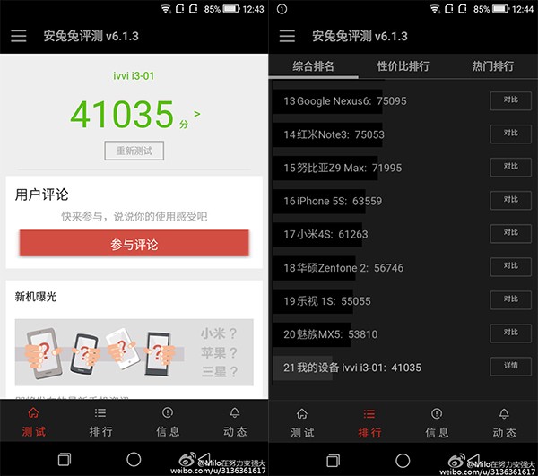 至于性能方面。由于红米3S并未上市,目前也还未有媒体评测上线,该机实际表现有待观察。不过,我们可以从同样搭载骁龙430的ivvi i3管中窥豹。根据网友用ivvi i3手机基于跑分软件安兔兔(V6.1.3版本)的实测来看,该机最终拿到了41035分,在数据库中排名第21位。作为对比,魅族去年中端旗舰机型、搭载联发科MT6795八核的MX5跑分在5.3万。