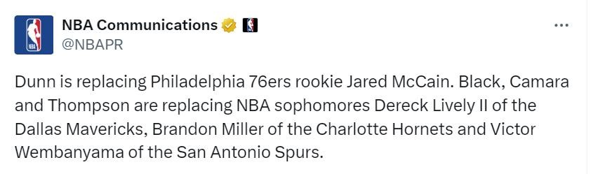 官方表示,邓恩将取代76人队新秀麦凯恩,后者于12月18日接受了手术,修复左膝外侧半月板撕裂,赛季报销。布莱克、卡马拉和奥萨尔-汤普森将取代独行侠的莱夫利、黄蜂的布兰登-米勒和马刺的文班亚马。